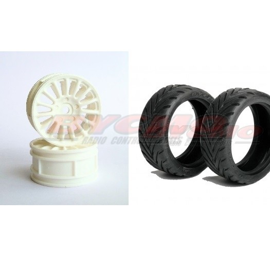 Pack compuesto por un juego completo de cuatro ruedas con neumático para pista, interior y llanta para coche de radiocontrol térmico escala 1/10.