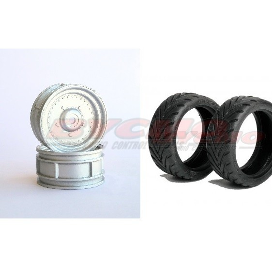Pack compuesto por un juego completo de cuatro ruedas con neumático para pista, interior y llanta para coche teledirigido térmico escala 1/10.