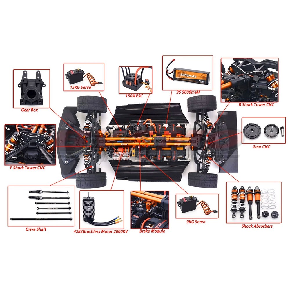 Con un potente motor sin escobillas de 2000 kV, tracción total 4x4 y velocidad máxima de hasta 130 km/h, este vehículo radiocontrol es perfecto para los entusiastas que buscan velocidad, potencia y control en un solo paquete.