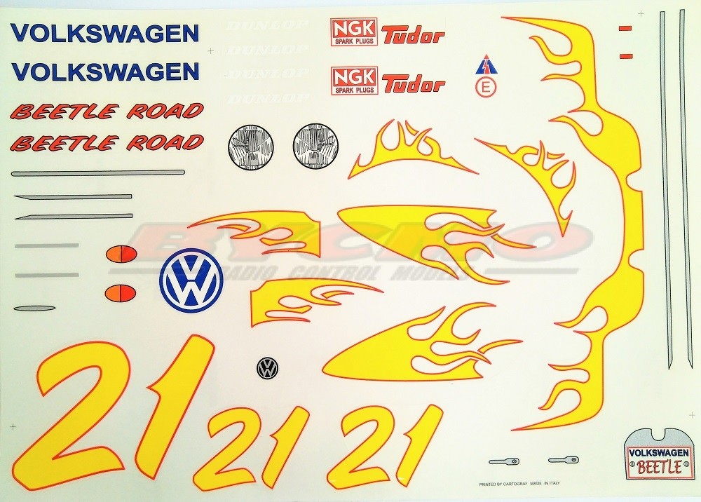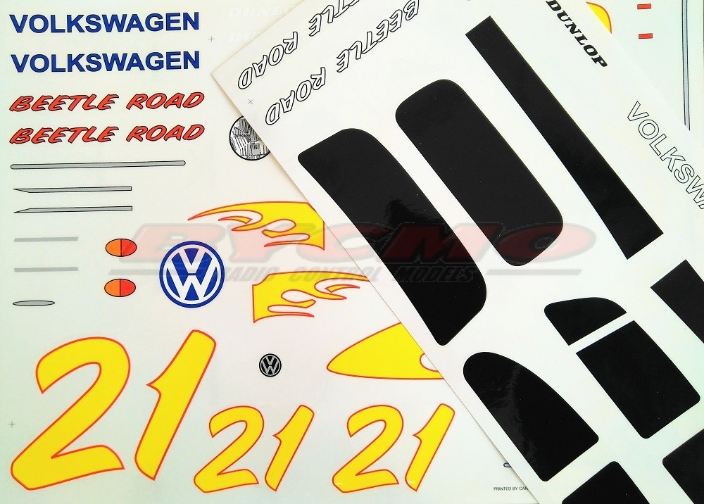Decoración del clásico modelo VW Beetle para nuestro coche de radio control escala 1/10 eléctrico. El conjunto de esta decoración para coche teledirigido se compone de 2 hojas de vinilo de gran calidad, precortadas para su fácil colocación.